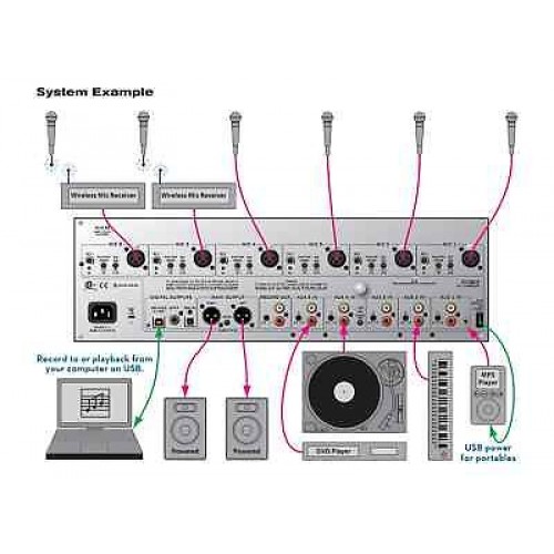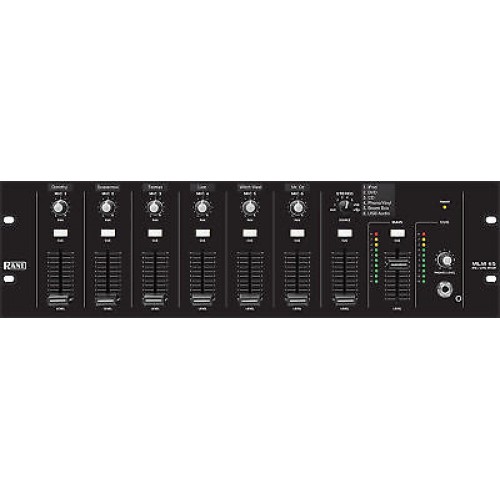 The Rane MLM 65 Mic/Line Mixer is designed for easy manual mixing of up to 6 mic/line inputs and playback of one of several stereo audio sources, including modern USB audio and old school vinyl. The MLM 65 features and topology are simple for non-technical operators, and it's dedicated USB Charge port supports the kids' MP3 players. The MLM 65 provides 6 manually mixed mic/line XLR inputs each with a front panel Pan and Fader Level control, plus a window slot atop each input for installer-created labels. These inputs also have independent rear panel screw-driver Gain trims, Overload indicators, 12 volt Phantom Power and Mic/Line switches. One of six stereo Aux inputs is selectable on the front panel with a Level fader for the selected source being mixed. A single large window slot for installer-created Aux source labels makes operation simple for newbies. The stereo Aux inputs include five consumer RCA inputs each with screw-driver input gain trim. The Aux 1 input provides an additional 3.5 mm stereo TRS jack and an adjacent dedicated USB Charge port for an iPod or other USB-powered audio device. For audio sources requiring diamond needles drug through the spiral-grooved black lacquer discs of yore, the Aux 4 input's phono/line switch satisfies those addicted to the warm even-order harmonic distortion of phono cartridges. A large phono ground post is nearby for added sheen. The sixth Aux input enters via the USB Audio port. The MLM 65 registers as a standard USB audio device with either Windows Write a reviewYour Name: Your Review: Note: HTML is not translated! Rating: Bad Good Captcha
